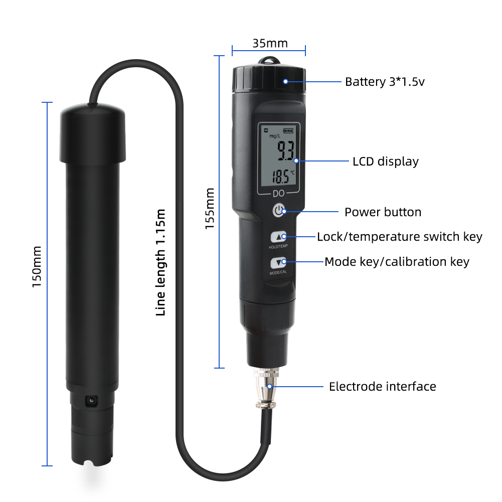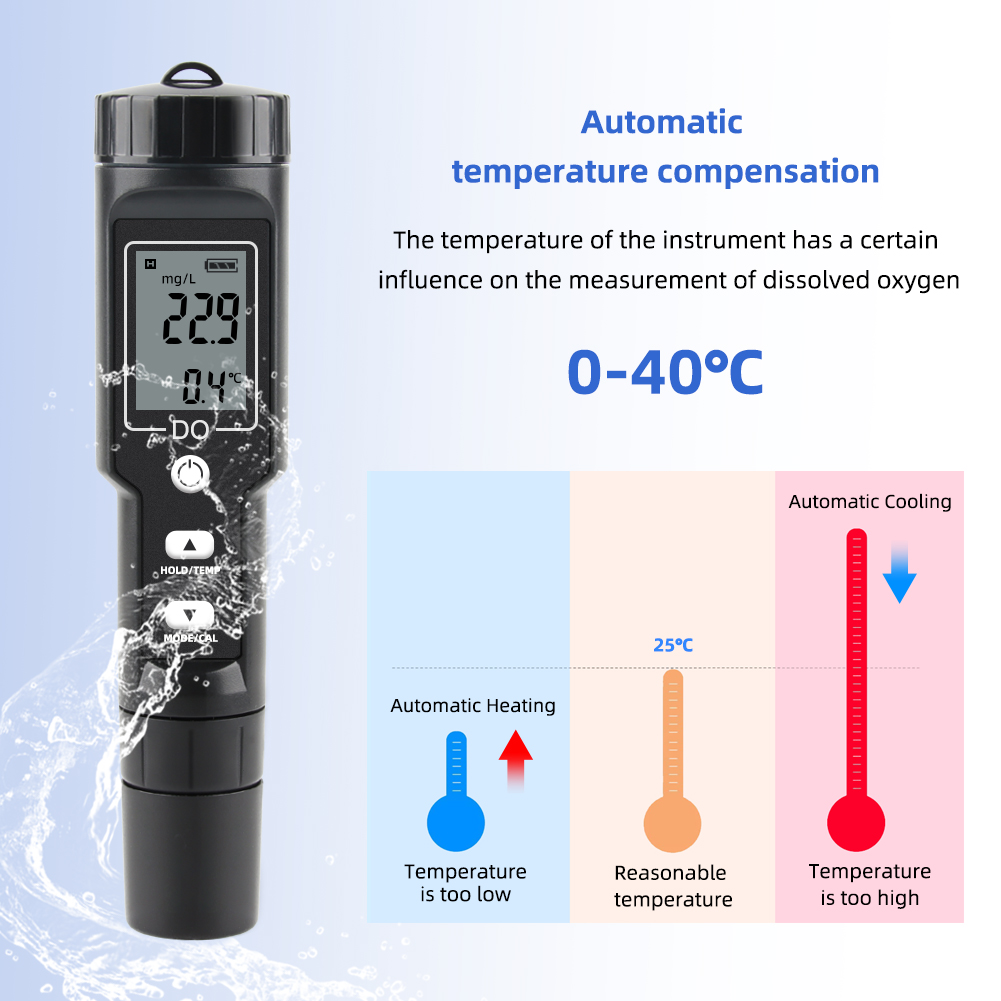 Sử dụng màn hình kỹ thuật số có đèn nền, rõ ràng hơn và thuận tiện hơn khi đọc dữ liệu. Tự động tắt nguồn trong 8 phút nếu không sử dụng. Chỉ báo pin yếu. Khả năng hòa tan oxy sẽ bị ảnh hưởng bởi nhiệt độ, áp suất khí quyển và độ mặn. Dụng cụ của chúng tôi có bù nhiệt độ có thể đáp ứng nhu cầu sử dụng bình thường.