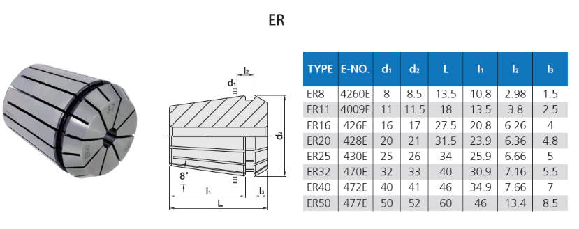 Được làm từ thép các-bon cao, sau khi được sử lý nhiệt, collet có độ cứng và độ nhám ổn định, độ mài bóng tốt hơn, độ đàn hồi cao và tuổi thọ dài hơn.