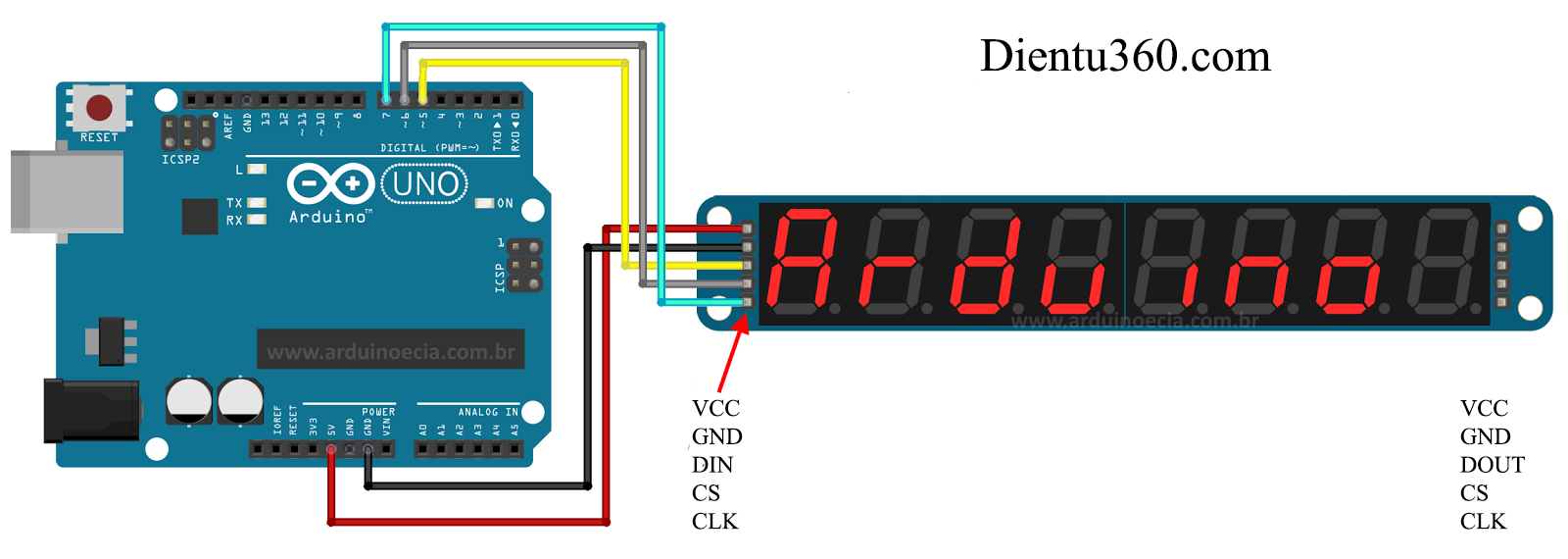 -Module sử dụng IC Max7219 là IC tích hợp bao gồm 24 chân và chỉ sử dụng 3 chân dữ liệu và 2 chân nguồn kết nối với Arduino để điều khiển.